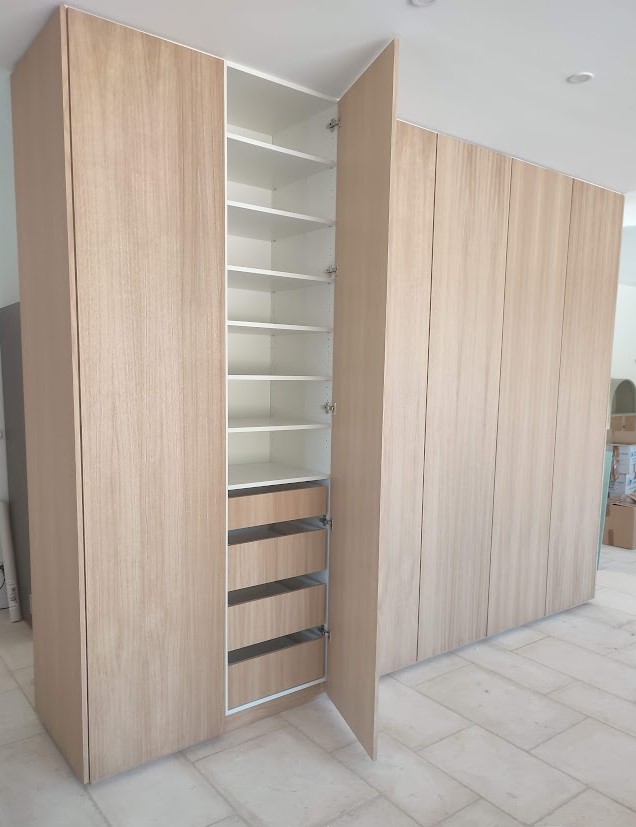 Dressing en MDF peint et façade de tiroir en chêne vernis